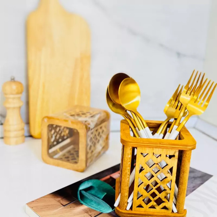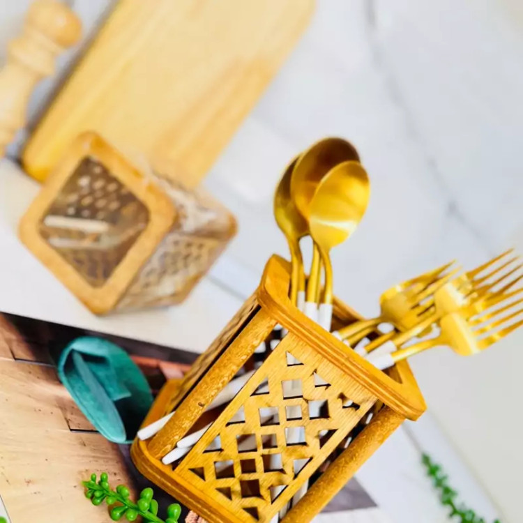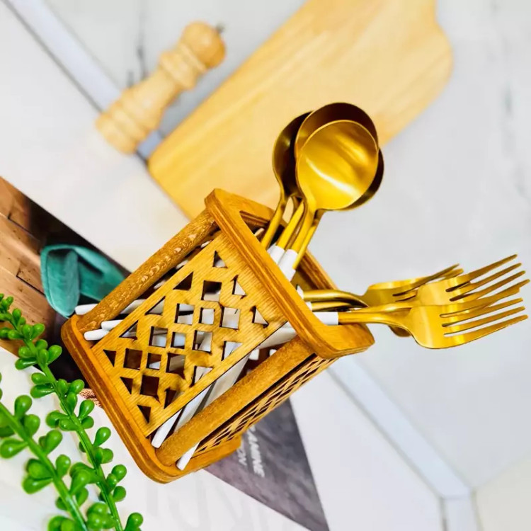 جاقاشقی چوبی ایستاده مدل ژینا، انتخابی شیک و کاربردی برای آنهایی ست که به نظم، زیبایی و هماهنگی با طبیعت در فضای آشپزخانه اهمیت میدهند. این محصول با طراحی استوانه ای و ایستاده، جای کمی میگیرد اما ظرفیت مناسبی برای نگهداری انواع قاشق، چنگال، چاقو یا حتی کفگیر و ملاقه دارد.