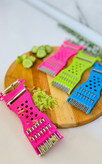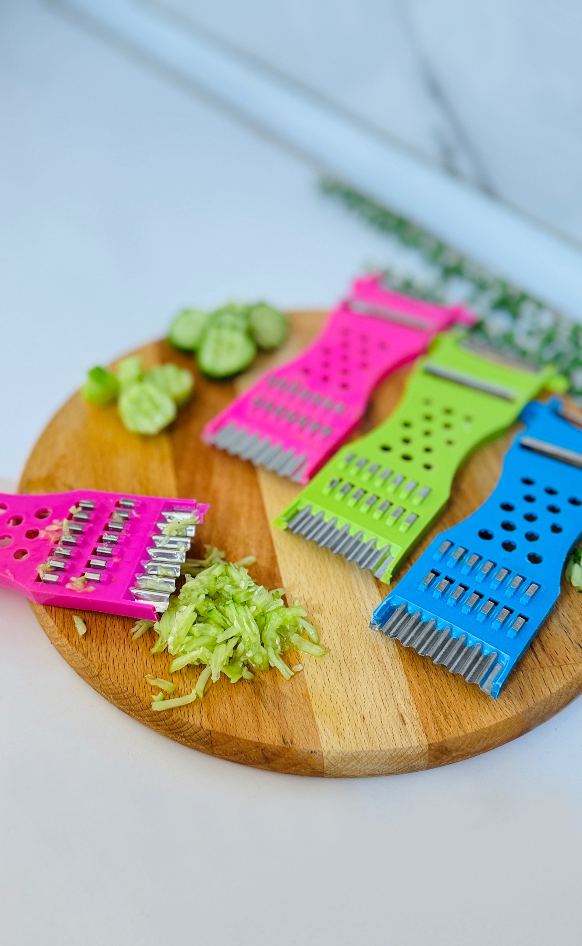 این رنده با چند نوع تیغه متفاوت به شما امکان میده تا سیب زمینی، هویج، خیار، کدو، پنیر و حتی میوه ها رو در سایز و شکل های مختلف برش بدین یا رنده کنین.
