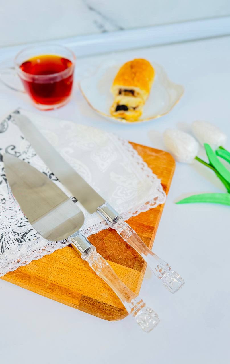 ست کارد و کفگیر کیک با دسته های کریستالی، یک انتخاب شیک و کاربردی برای برش و سرو انواع کیک و دسر است.